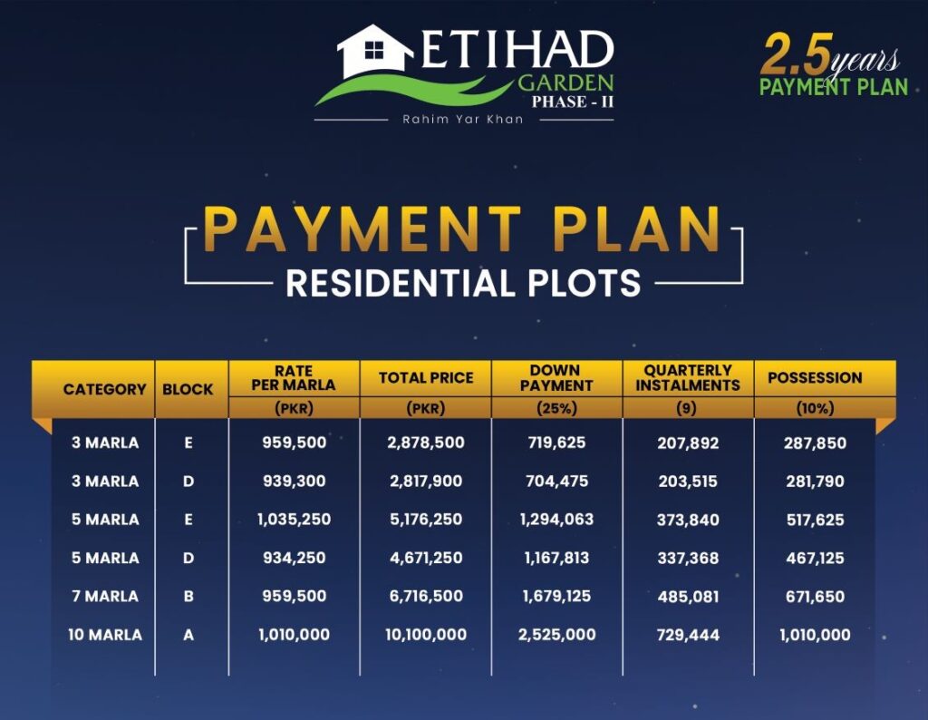 Etihad Garden Phase 2 offers a convenient 2.5-year payment plan for residential plots. Plot sizes include 3 Marla, 5 Marla, 7 Marla, and 10 Marla in multiple blocks.