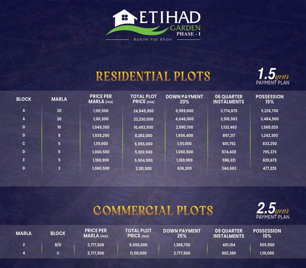 Phase 1 includes Blocks A through E. Block A offers 1 and 1.5 Kanal plots. There are other blocks which offer 5, 8, and 10 Marla plots. Meanwhile, Etihad Garden Phase 2 introduces 3, 5, 7, and 10 Marla plots. Etihad Garden Phase 3 expands future residential and commercial options for buyers.
