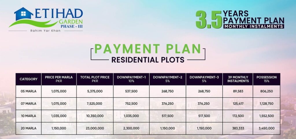 Etihad Garden Phase 3 offers a flexible 3.5-year payment plan for residential plots. Available plot sizes include 5 Marla, 7 Marla, 10 Marla, and 20 Marla. The booking is split into three easy down payments: 10%, 5%, and 5%. Buyers can choose between 39 monthly installments or 12 quarterly installments. A 15% possession amount is payable near the end of the payment schedule.